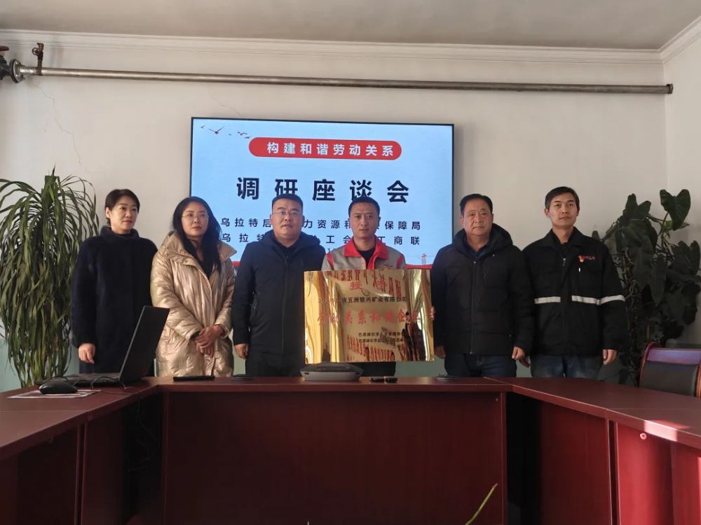 12月25日,烏拉特后旗人社局黨委書記、局長敖日格樂,總工會副主席潘瑩,工商聯(lián)副主席馬述敏等一行人到訪,在公司二樓會議室開展座談會并進行“勞動關系和諧企業(yè)”授牌儀式,公司黨支部副書記、經理史小亮,職能部室人員參加座談會。